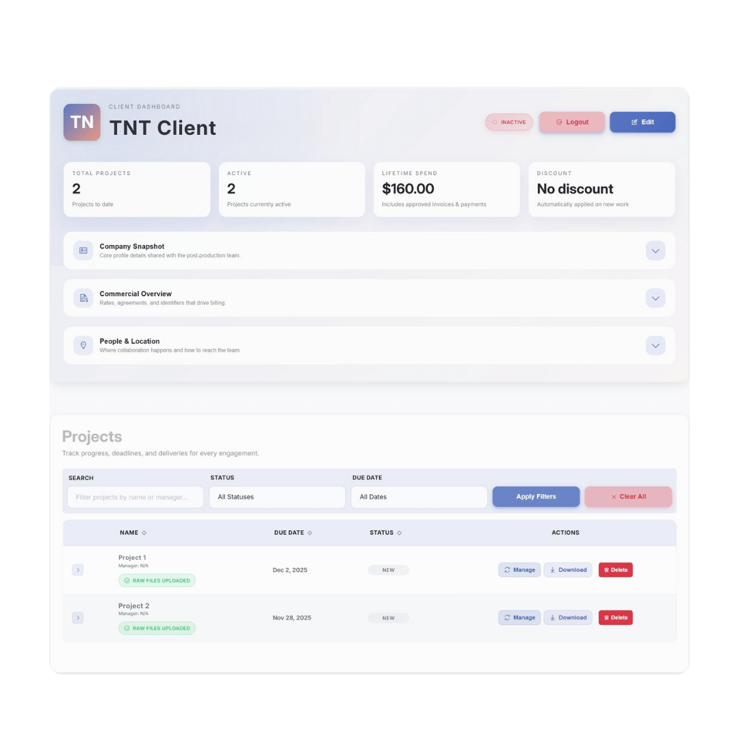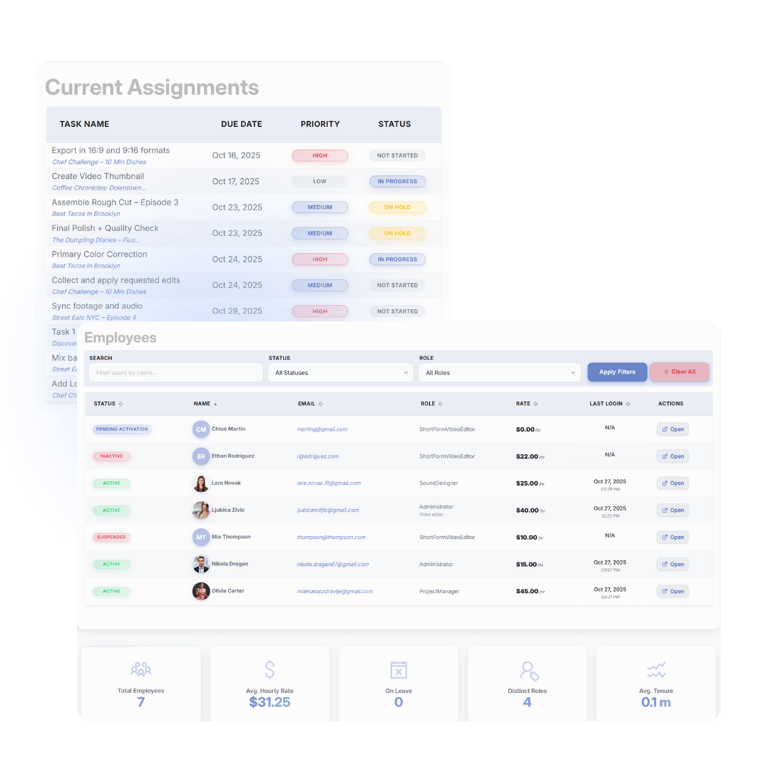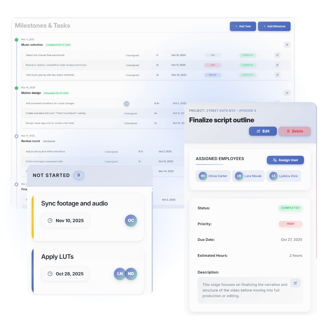 EditWise replaces Trello, Clockify, Sheets, Frame.io, Drive links, and email chaos with a clean, structured environment built for real-world editing pipelines.