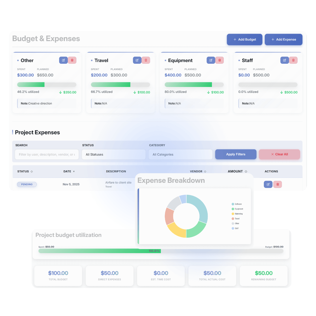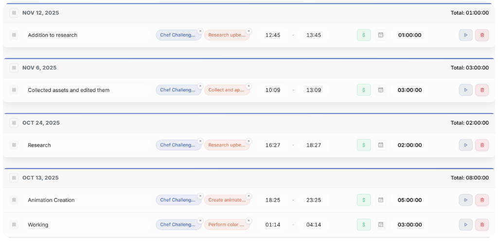 Manual time entries. Stopwatch mode. Log time from tasks. Filter by editor, client, project. Billable vs non-billable. Time approvals. Team time overview. Exportable logs.