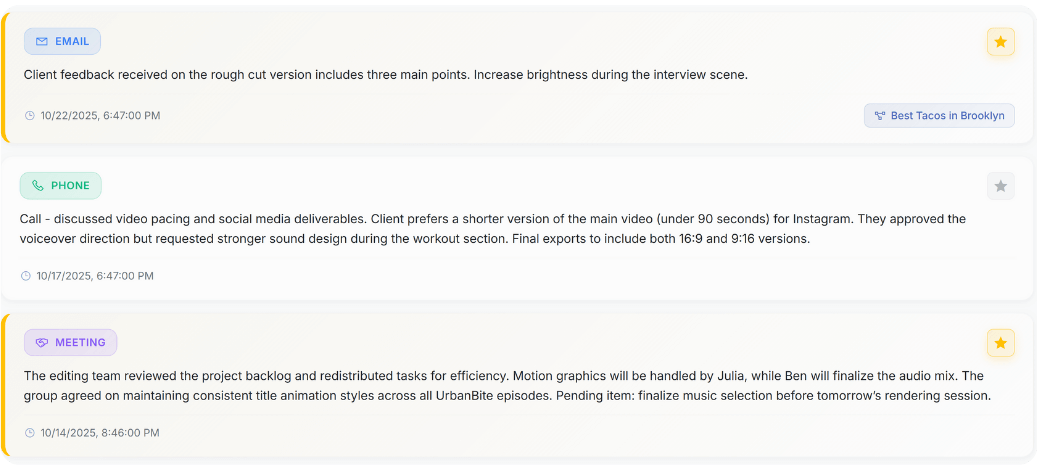 Everything is categorized automatically based on the project and its segments. This eliminates file sprawl — the #1 operational pain for scaling agencies.