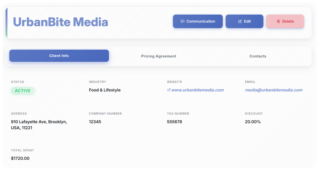 Contacts, agreements, pricing models, communication logs — everything organized by client, not lost in inboxes.