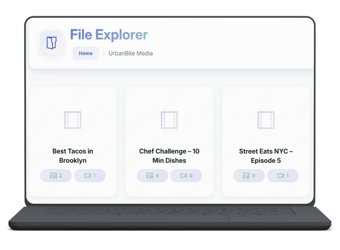 File Explorer Features. Global file explorer. Project folder structure. Segment + deliverable linking. File upload. File metadata. Version tracking. Raw files + exports organization. Search & filtering.